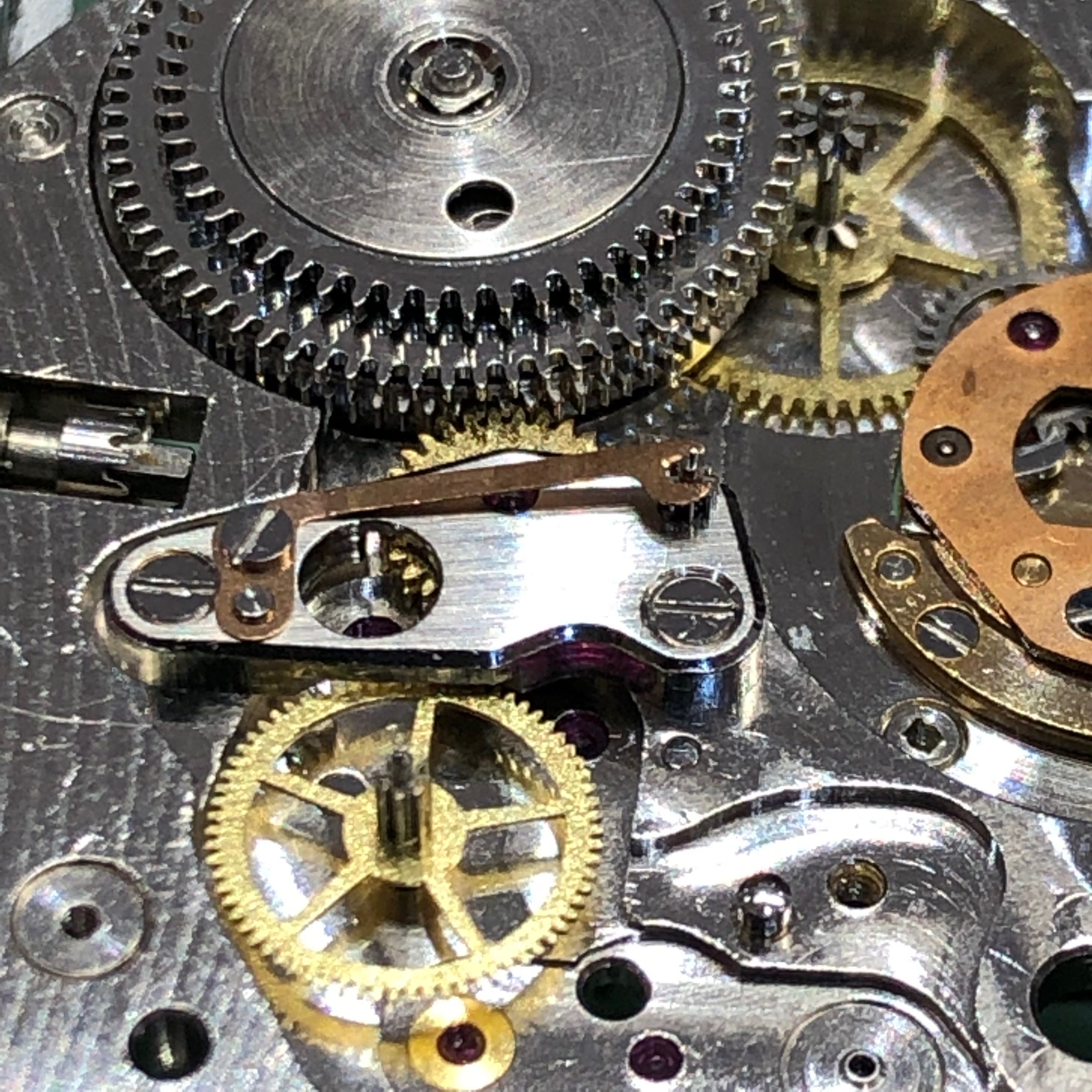 Podemos ver en la primera fotografía el piñón de centro (lo que también se podría llamar rueda de centro si tuviera llanta) con su puente que lo mantendrá sujeto. Este es otro ejemplo de la calidad de este calibre, ya que este sistema de anclaje del piñón solo se ve en calibres de gran acabado tipo Rolex u Omegas antigüos, cuando Omega montaba calibres propios tipo el 562, antes de montar sus relojes con maquinarias ETA.